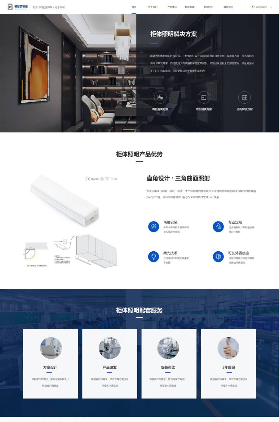 結(jié)合賽萊特照明的產(chǎn)品屬性和品牌元素,圍繞LED照明網(wǎng)站設(shè)計風(fēng)格,整站采用科技藍為主色調(diào),環(huán)保綠為輔助色,網(wǎng)站整體風(fēng)格簡約大氣不會顯得雜亂,符合LED照明網(wǎng)站制作的特性