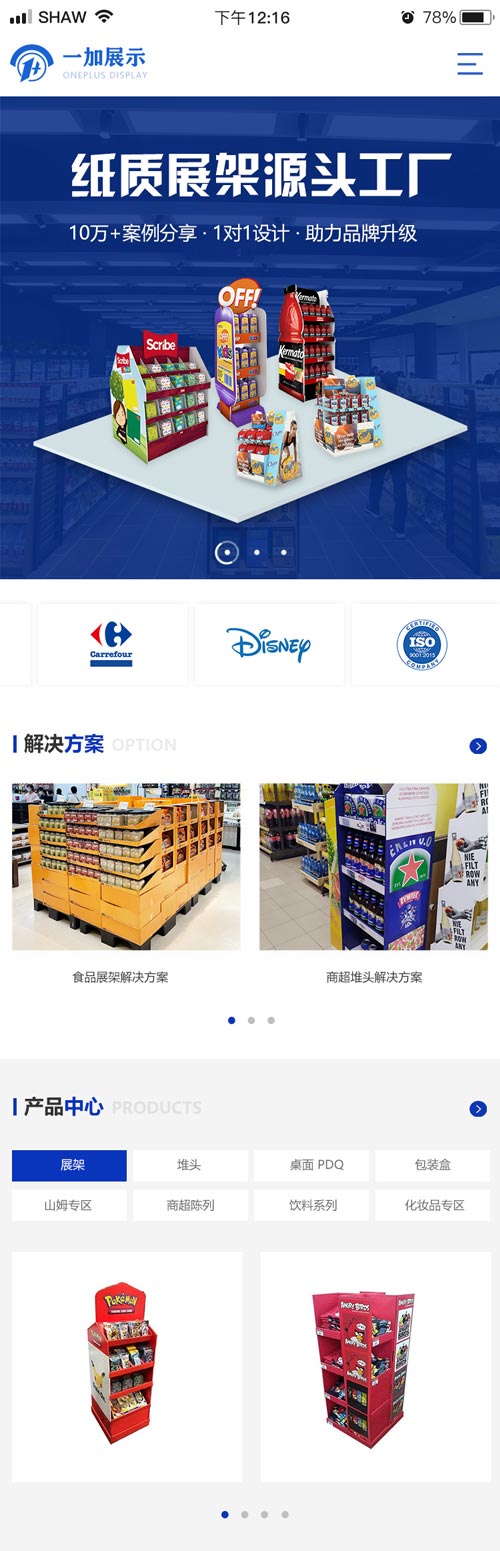 項(xiàng)目背景一加展示是一家致力于為全球零售商提供一站式POP展示架和包裝陳列的終端生產(chǎn)商?;谝患悠髽I(yè)對(duì)網(wǎng)站的需求定位主要以提升品牌形象加強(qiáng)營(yíng)銷力為主,展開對(duì)展示架網(wǎng)站建設(shè)整站的策劃設(shè)計(jì)。