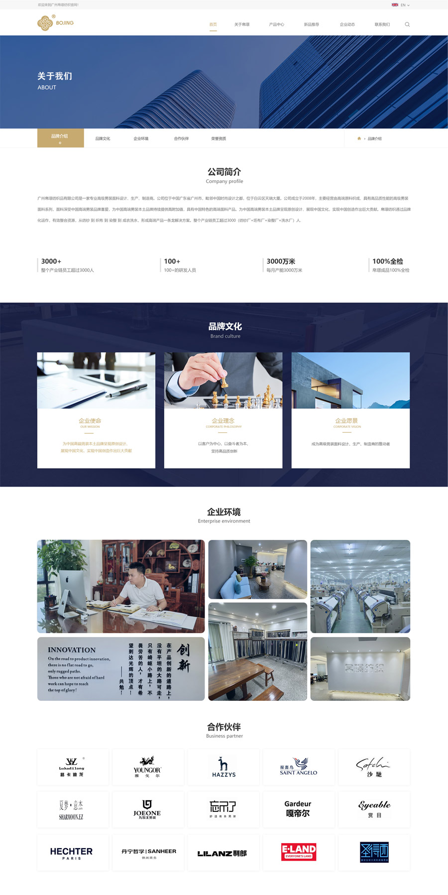 基于帛璟主要生產(chǎn)高端面料產(chǎn)品和品牌屬性所以在顏色上采用黃色為主色調(diào),藍(lán)色為輔助色,網(wǎng)站整體風(fēng)格非常簡(jiǎn)約大氣,很符合紡織品網(wǎng)站設(shè)計(jì)風(fēng)格特性。