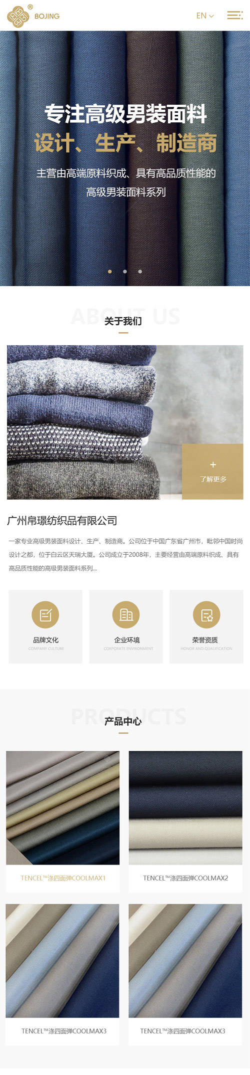 項(xiàng)目背景一家專業(yè)高級(jí)男裝面料設(shè)計(jì)、生產(chǎn)、制造商,公司成立于2008年整個(gè)產(chǎn)業(yè)鏈員工超過(guò)3000人,基于帛璟以品牌展示為建站目標(biāo),主要以提升品牌形象展示企業(yè)產(chǎn)品為主,圍繞紡織品網(wǎng)站設(shè)計(jì)行業(yè)屬性展開(kāi)整站的策劃設(shè)計(jì)。