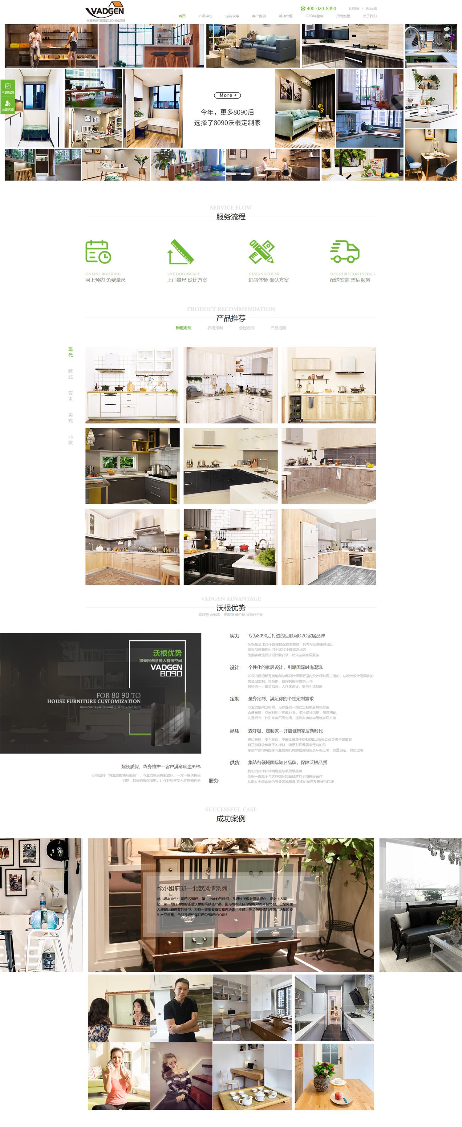 結(jié)合沃根的logo元素及櫥柜定制的行業(yè)屬性,將網(wǎng)站主色調(diào)定位環(huán)保綠,將白灰色作為輔助色,網(wǎng)站整體風(fēng)格保持著時(shí)尚簡(jiǎn)約的環(huán)保風(fēng)格